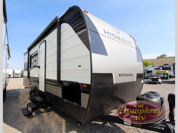 With any Hideout Sport travel trailer by Keystone you will enjoy simplified camping solutions that won't break the bank! Each model is constructed with a durable AlphaPly TPO roof membrane, tinted safety glass windows, and an I-beam frame. There are power tongue jacks and heavy duty stabilizer jacks that will make it easier than ever to hitch up and go. An XL entry assist handle will also provide convenience, along with a power awning that will provide much wanted shade during the day. You will feel right at home inside with stylish decor, blackout night shades, and cozy bed with storage underneath!