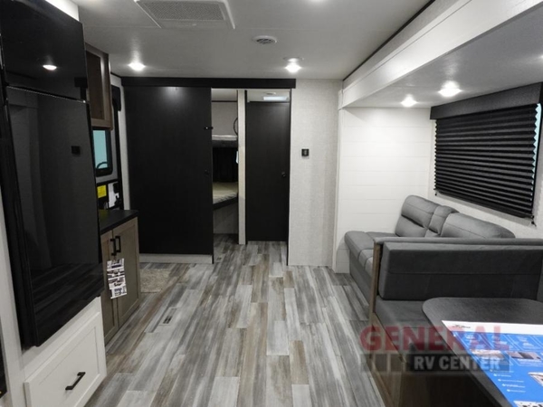 You can't go wrong with this Jay Flight in tow! The little ones or your guests will love the rear bunkhouse with 48" x 76" bunk beds plus a half bath here and counter space to set their things on. The front of this unit houses the private bedroom with a queen bed, and the full bath is close by for easy nighttime use. Everyone can meet in the main living area to play a game around the U-shaped dinette or sofa, and there is a wardrobe/entertainment center . A fully-equipped kitchen lets you cook meals inside each day, but you may just find yourself outdoors cooking on the pull-out griddle with an LP Quick Connect!