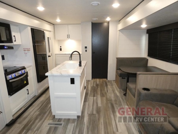 The whole gang can join along on camping trips in this triple slide out travel trailer! There is a rear private bunkhouse with a bunk bed and J-cube futon sofa below plus a second bunk bed and storage below to help keep this space tidy. You'll find your own space in the front private bedroom, which also includes a queen bed and dual wardrobes. The middle kitchen and living room will be a favorite place to come together since there is a sofa and booth dinette, a kitchen island, plus a fully-equipped kitchen to make meals each day. There is also an exterior camp kitchen when you want fresh air!