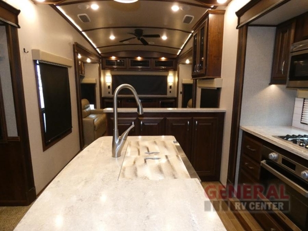 As you tour the countryside and make memories with the family, you will want this Pinnacle fifth wheel right by your side! This model gives you all the space you need to enjoy yourself with five slides that open up the interior and give you room to have fun together in the rear separate living room. As you prepare dinner, you will also appreciate having the ability to move around freely as you serve appetizers on the bar top counter and clean up the dirty dishes in the double sink on the kitchen island. Nothing will be more relaxing than retreating to your own luxurious haven in the front private bedroom where you can drift off to sleep comfortably on the king-size bed while your favorite movie is playing on the 32" LED HDTV.