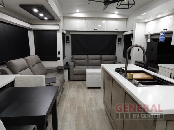 Trips to the lake are made comfortable in this triple slide out fifth wheel. Once you arrive at the campground, set up the two power awnings with LED lights, and there is an exterior TV for the big game. Head inside to relax on the theater seats directly across from the TV and fireplace, or play a game at the roll-top dinette. The chef of your group will love this kitchen with its residential refrigerator, kitchen island, and pantry, plus additional storage for canned goods or paper products. The full bath will allow you to stay clean throughout your trip, and you'll find a residential style backsplash in the bath, plus a walk-in shower. Nothing says luxury like your own king bed slide out in the front bedroom, a large front closet with hamper and drawers for wrinkle-free clothes, and a flip-up dresser featuring a 32" TV!
