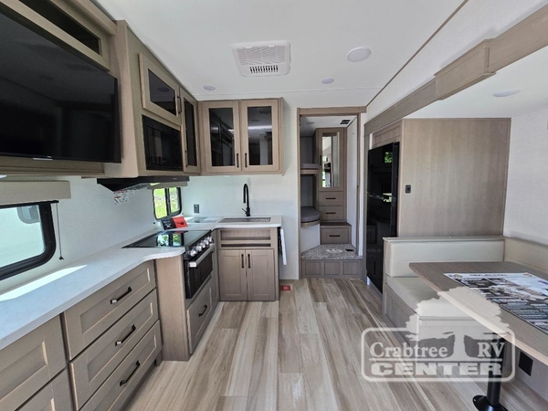 Camping with friends and family just got a whole lot easier in this fifth wheel with double-size bunks and a front private bedroom. Your guests will also have a wardrobe to keep their things tidy, and the bedroom closet will be perfect for your things. If you have other guests stay over, they can sleep on the U-shaped dinette within the slide out or the tri-fold sofa, and there is a 40" high-definition LED TV here to keep everyone entertained on rainy days. Everyone can take turns cleaning up in the full bath that includes a residential walk-in shower, a power vent fan, plus a large vanity top with a deep sink. And you will feel right at home in the front private bedroom with its queen bed, overhead cabinets, and TV prep if you'd like to add a television!
