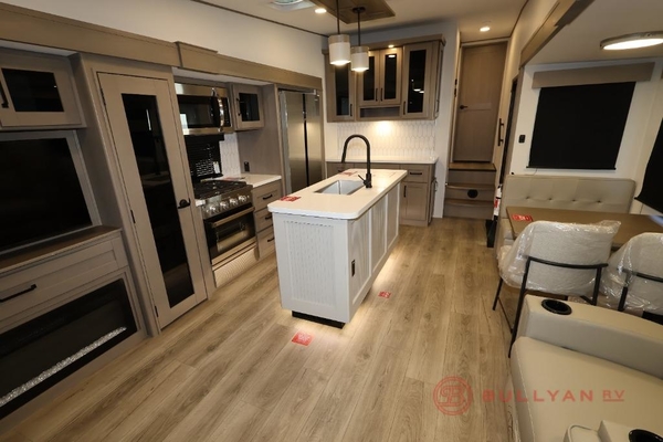 You can enjoy a spacious rear living area in this RV with dual opposing slides offering you entertainment, kitchen amenities, seating and windows for great views! The rear tri-fold sofa also converts into extra sleeping space for an extra guest or two, just like the booth dinette does. Yet you might like to add the swivel dinette option. There are theater seats to enjoy while you place your drinks in the cupholders and watch the entertainment center with a 40" LED HDTV and fireplace. The pantry is big enough to store your favorite snacks, and the kitchen island will make meal prepping easier, plus there is a 16 cu. ft. refrigerator to store any leftovers. The full bathroom has a 30" x 48" fiberglass shower and a linen closet to store your towels. The front private bedroom has a comfortable queen bed slide that can be switched out for the optional king bed, a dresser with overhead cabinets, and a full wall wardrobe that is prepped to add the optional washer and dryer so that you can extend your camping trip with clean clothes!