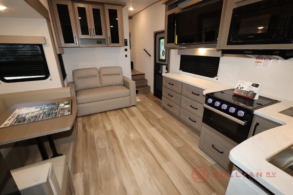 Camping with friends and family just got a whole lot easier in this fifth wheel with double-size bunks and a front private bedroom. Your guests will also have a wardrobe to keep their things tidy, and the bedroom closet will be perfect for your things. If you have other guests stay over, they can sleep on the U-shaped dinette within the slide out or the tri-fold sofa, and there is a 40" high-definition LED TV here to keep everyone entertained on rainy days. Everyone can take turns cleaning up in the full bath that includes a residential walk-in shower, a power vent fan, plus a large vanity top with a deep sink. And you will feel right at home in the front private bedroom with its queen bed, overhead cabinets, and TV prep if you'd like to add a television!