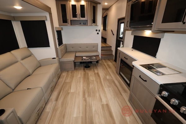 You will love this fifth wheel featuring a single slide for added interior living space and all the comforts and conveniences it provides you while you travel. The slide features a 78" theater seat plus there is a breakfast nook for more seating. Both can easily view the entertainment center with 40" TV. A rear kitchen indoors provides everything you need to create meals like home while on the road, and if you want to spend as much time outside as possible, then the outdoor griddle will certainly accommodate you for meals. Up front, a cozy private bedroom with queen bed, wardrobe, and overhead cabinets. Right next door, you will find a large walk-in shower, as well as a toilet, and a vanity with sink and linen cabinet for your towels and toiletries. You will also love the full unobstructed pass-through compartment for all of your gear, plus so much more!
