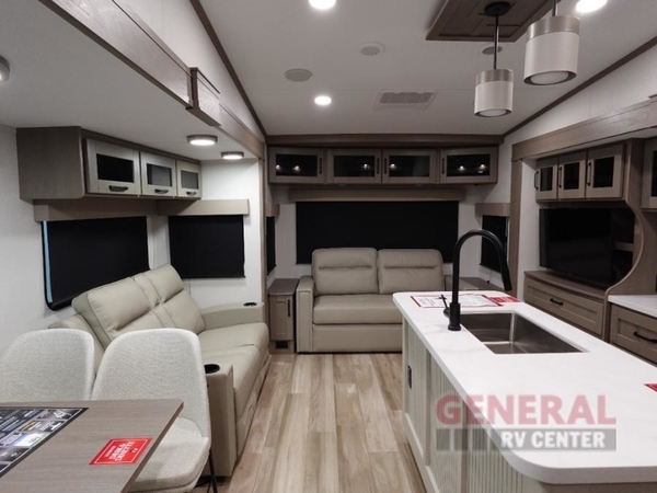 Travel to see new state parks, RV resorts or your family in other states as you tow this fifth wheel to each destination! You will enjoy comfort and convenience, plus a place to work, and be able to offer extra sleeping space for friends and family when they visit. The middle extra room provides a tri-fold sofa slide, a desk, a wardrobe, plus a 64" x 88" upper bed loft area with access from the hallway. The full bathroom will keep everyone refreshed, and the front bedroom allows you to sleep on a bed slide. And the kitchen island, appliances, and large pantry allow you to take everything you need with you.