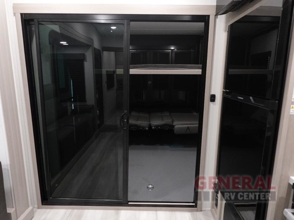 Start your engines for a fun weekend with your toys and your family in this Momentum G-Class toy hauler. The 11' separate garage includes Happi-Jac rollover sofas with a table and a top bed, plus a flip-up pet dish for your furry friends! There is even a second entry door which leads directly into the garage so that you don't have to walk through the entire trailer just to get to your cargo. In the front of this unit, you will have your own master suite that has private access to the residential walk-in shower in the dual-entry bathroom. The main living and kitchen area offers everything you need and would want, including theater seating and a TV with storage above the refrigerator!