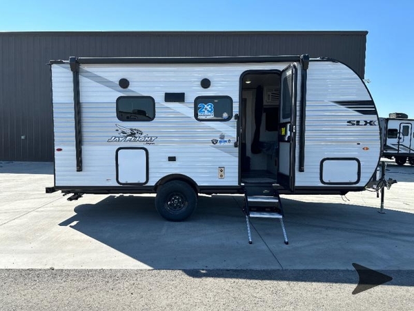 The Jayco Jay Flight SLX travel trailer is quite easy to own because it is lightweight for an easier towing experience. Built on a fully integrated A-frame with galvanized-steel, impact-resistant wheel wells, the Jay Flight SLX has quality at its very foundation. That quality continues on to the electric self-adjusting brakes, easy-lube hubs, Magnum Truss roof system, and LP quick connect. Some of what the mandatory Customer Value Package includes is backup camera prep, Keyed-Alike entry and baggage doors, marine grade exterior speakers, and an on-demand tankless water heater.
