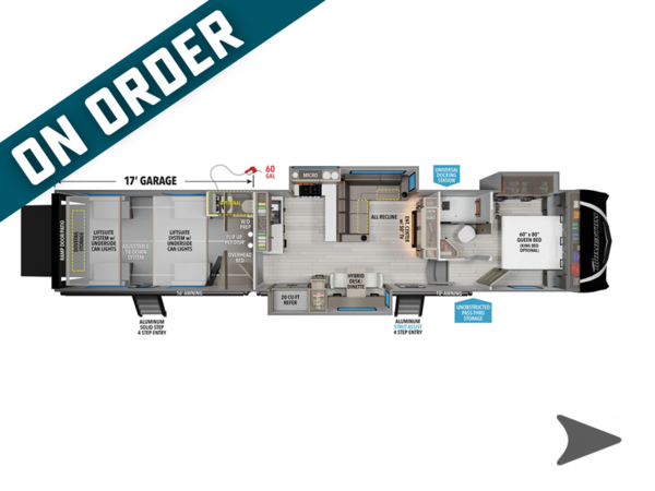 This toy hauler with a 17' separate garage will be perfect for your outdoor adventures. There is an adjustable tie-down system to keep your gear secure, an overhead loft bed, plus an optional half bath. And two optional Liftsuite Systems can be added if you need more sleeping space. There is also washer and dryer prep here, along with a flip-up pet dish for your furry friends. The chef will love the large kitchen countertop for more meal prep space, and there is a 20 cu. ft. refrigerator and pantry for food storage. You can get comfy on the L-shaped sofa across from the 50" TV, or get some work done at the hybrid desk/dinette. There are also dual opposing slides here for added space. The third slide out is found in the front master bedroom, which includes drawers and storage space for your things. A queen bed will provide a great night's rest, and you have the option to choose a king bed if you want more space to stretch out!