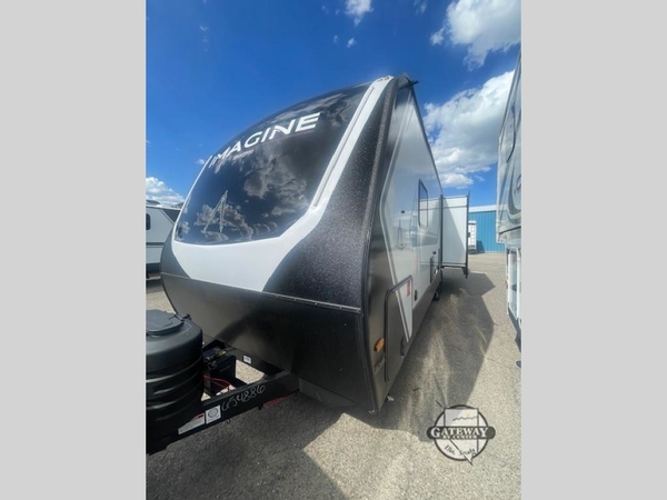 This Imagine travel trailer has opposing slides to provide you with ample living space on the interior once you've parked and set up! You can use the tri-fold sofa and theater seating to relax, and the booth dinette is another seating space that you can use for dinner time or game nights. The entertainment center has a LED HDTV with fireplace below, which is great for movie night.  When outside, you will love the two power awnings to sit beneath to keep you protected from the sun while you have fun at your campsite. The exterior also offers you an LP quick connect and a coax TV hookup.
