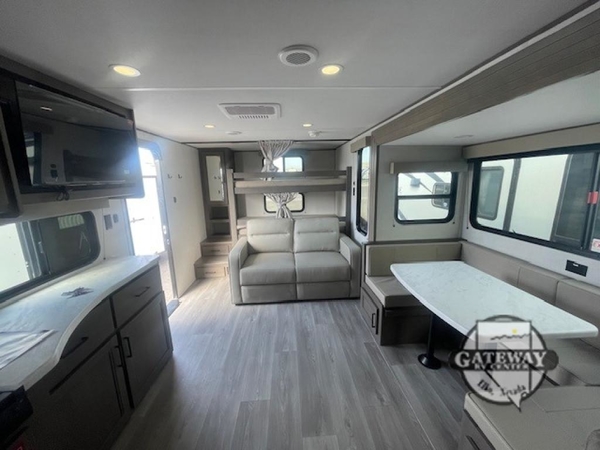 Your crew of eight will love camping in this spacious travel trailer! There are double-size bunks in the back with step storage and an added wardrobe for your guests' things plus exterior storage for camp gear galore. A walk-thru bath will create a front master bedroom you are sure to love, especially with its queen bed, wardrobe storage, and private exterior entry door! The main living area will be a favorite place to hang out with its U-shaped dinette, theater seating and 32" TV. If the weather is nice, you may just find yourselves outdoors since there is a rear exterior griddle and 1.7 cu. ft. refrigerator!