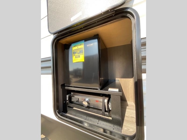 Get ready to take your travels to new heights with our incredible luxury travel trailer! The front bedroom has a queen bed, wardrobe, and overhead cabinets for all your favorite belongings, the perfect place to relax and recharge after a long day of adventure. The living room/kitchen combined area is equipped with a U-shaped dinette, three-burner cooktop, microwave, refrigerator, pantry, and 62 theater seating. Perfect for cooking up your favorite meals, entertaining friends and family, or simply relaxing and enjoying the comforts of home. The full bathroom is spacious and complete with a linen closet for added convenience. And with double-sized bunk beds featuring curtains and under-bunk storage, the kids will have their cozy retreat. But the adventure doesn't stop there! Outside, you'll find an exterior griddle with a 1.7 refrigerator, perfect for cooking up a storm in the great outdoors. And with a massive 19 awning, you'll have plenty of shade and protection from the elements, plus, with two entry/exit doors and pass-through storage, you'll have easy access to the trailer and all your gear.