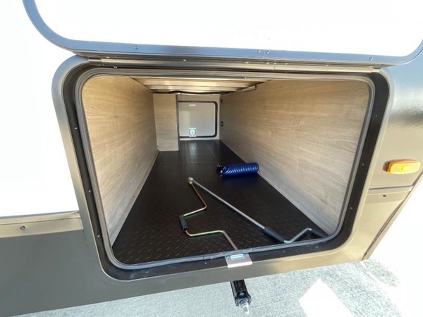 You will love this family bunkhouse trailer with dual entry/exit doors with one door leading directly into your rear private bedroom featuring a slide out queen bed, desk, and storage!  A walk-through bath is also nearby for convenience and offers plenty of space being stretched across the width of the trailer.  The second entry, closest to the front, leads directly into your spacious combined kitchen and living area.  Here you will enjoy counter prep space for cooking, a three burner range and oven, plus overhead storage and drawers for all of your necessities.  Your refrigerator is within the large slide that also houses theater seating for relaxing, or you could choose the optional tri-fold sofa if you are used to having overnight guests. This unit has a U-shaped dinette which can seat all occupants easily. In front, a private bunkhouse with a 42" x 93" top bunk and 52" x 93" bottom bunk easily sleeping three.  On the outside, a spray port to rinse off feet or your furry pal, LP quick connect, and a 21' awning to provide added living space to enjoy outdoors!