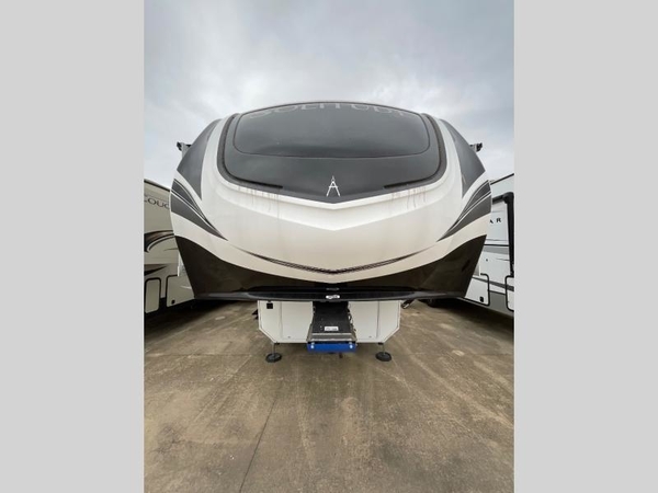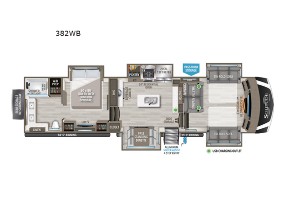 If you enjoy entertaining while camping, you will love this setup with a wet bar including a beverage cooler, a kitchen island to set snacks on, and a hutch for storing dishes. And, the gourmet kitchen appliances with a 24" residential oven and four-burner range along with a 20 cu. ft. refrigerator allow you to cook any meal for your family and friends. The separate front living room is spacious with dual opposing tri-fold sofa slides and theater seating, and a front wall with an LED telescoping TV and fireplace below plus storage for entertaining. There is also a curtain to close at the pony wall for privacy when friends are sleeping on the sofas. You will have your own master bedroom with a queen bed slide (or optional king), wardrobes, an LED TV, plus sliding doors that lead into the private master bath. Here you will find dual sinks, a shower with flip-down teak seat and skylight, plus washer/dryer prep which is great for when you plan to stay awhile.