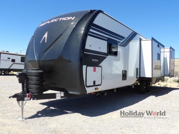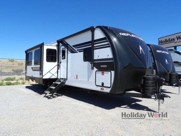 With any Reflection travel trailer by Grand Design, you will have a solar panel for off-grid camping and a 60 amp charge controller and inverter prep, a Universal All-In-One docking station, unobstructed pass-through storage, and Goodyear Endurance tires. Each is constructed of gel coat exterior sidewalls, residential 5" truss rafters, walk-on roof decking, a fiberglass and radiant foil roof and front cap insulation plus laminated aluminum framed side walls, roof and end walls in slide rooms. Head inside to enjoy residential hardwood cabinet doors, premium Congoleum flooring, a spacious shower with a glass door, and many more comforts!
