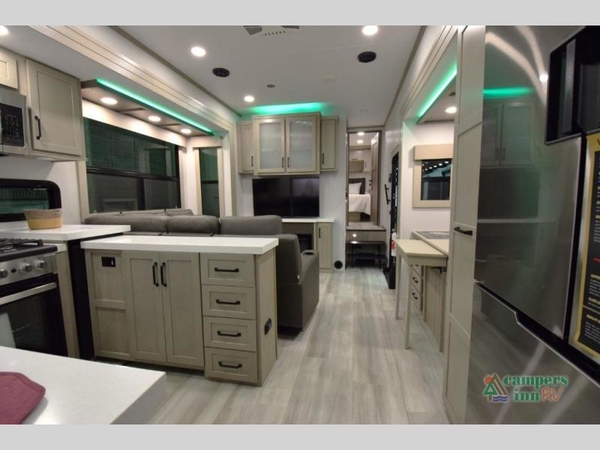 Inside, the dual opposing slides create an open and spacious feel, while the fireplace, L-shaped sofa with recline, and hybrid desk/dinette provide a cozy living area. The kitchen is fully equipped with generous counter space, a 20 cu. ft. refrigerator, professional-grade stainless steel cooktop, and solid surface countertops.
