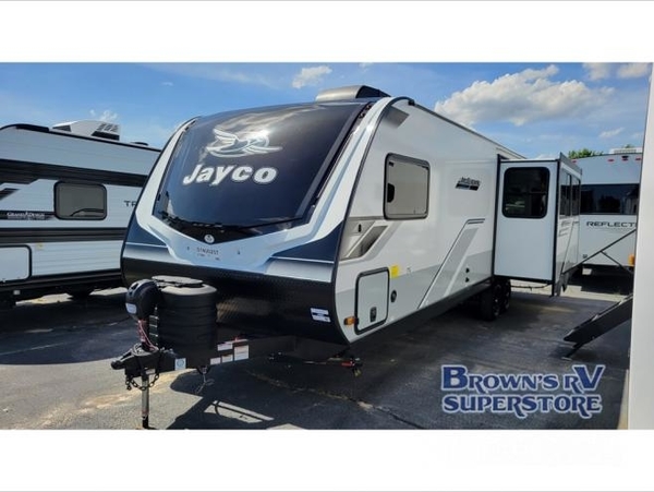 With any Jay Feather travel trailer by Jayco, you will enjoy lightweight towing, convenient exterior amenities, and at-home comforts inside! The Overlander 1 Solar Package included within the Jay Sport Package comes with a 200W solar panel and a 30-amp digital controller so you can enjoy some off-grid camping. There is also a modern graphics package with a dual-colored sidewall, LCI Solid Step fold-down aluminum tread steps on the main entry door, and Climate Shield 0 -100° F tested weather insulation package that will allow you to camp in all sorts of climates. The Customer Value Package will make time outdoors easier than ever with a power tongue jack and a Rock Solid stabilizer system, plus American-made nitro-filled Goodyear tires with self-adjusting electric brakes. More exterior features include a Keyed-Alike locking system, marine grade exterior speakers, a Magnum Truss roof system, and the list goes on! And we haven't even touched on the interior comforts, like the residential style seamless countertops and vinyl flooring throughout, decorative backsplash, handcrafted hardwood door/drawer fronts, and multiple USB charging ports to keep you going!