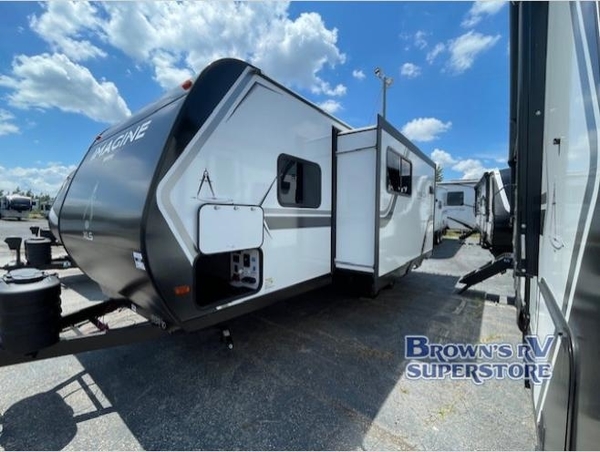 This Imagine XLS travel trailer has theater seating and a booth dinette that you can use any time you need a little break from the outdoors. If you want to come in and grab a coffee, put together a puzzle, or work on your itinerary for the week, just put up your feet and relax. You could even switch on the LED HDTV if you want a little entertainment. The front queen-size bed has a privacy curtain that you can draw to create a semi-private bedroom, and in the back of the trailer you will find the rest of your amenities, like the kitchen and the bathroom. The large slide makes it easy to enjoy spending your time indoors, but if you do want to get back outside, you can sit underneath the 18' electric awning for some shade.