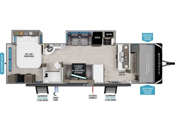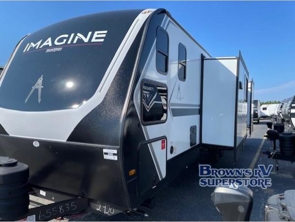 Just imagine leaving the world behind and secluding yourself away with your favorite people in your Grand Design Imagine travel trailer! The Imagine has been designed to enjoy extended season camping and includes a high-capacity furnace, a heated and enclosed underbelly with suspended tanks, a designated heat duct to the subfloor, and a high-density roof insulation with attic vent. You'll have maximum head room on the interior with 81" radius ceilings, and large panoramic windows to let in natural lighting. The exclusive drop-frame pass-through storage compartment is going to allow you to bring along lots of equipment, and the universal docking station is an all-in-one location for utilities and hook-ups. You'll also have oversized tank capacities so that you can fill and empty your tanks less often.
