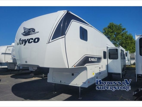 With any Eagle SLE fifth wheel by Jayco, you will enjoy a lighter tow weight, high-end finishes, and the same quality construction you've come to expect from Jayco! There is an Alpha Ply TPO roof membrane, a fully enclosed and heated underbelly, plus Stronghold VBL walls for added durability. There is also a rear 2" towing receiver outside, along with metal slam latch baggage doors, MORryde Step Above entry steps, and a Winegard Air 360 antenna with router prep if you want to stay connected as you camp. Once inside you'll enjoy the handcrafted and glazed door/drawer fronts, blackout pleated shades throughout, and residential vinyl flooring throughout with no carpet for an easier clean. The on-demand water heater, 30K BTU furnace, and 15K BTU "Whisper Quiet" A/C will ensure your comfort year around, and the optional Overland 1 Solar Package can be added if you need off-grid capabilities!