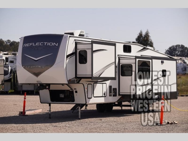 With any Reflection fifth wheel by Grand Design, you will have a solar panel for off-grid camping and a 60 amp charge controller and inverter prep, a Universal All-In-One docking station, unobstructed pass-through storage, and Goodyear Endurance tires. Each is constructed of gel coat exterior sidewalls, residential 5" truss rafters, walk-on roof decking, a fiberglass and radiant foil roof and front cap insulation plus laminated aluminum framed side walls, roof and end walls in slide rooms. Head inside to enjoy residential hardwood cabinet doors, premium Congoleum flooring, a spacious shower with a glass door, and many more comforts!