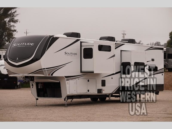 Each Solitude fifth wheel by Grand Design features a 101" wide-body construction, heavy duty 8,000 lb. axles, frameless tinted windows, and high-gloss gel coat sidewalls. You can camp year around thanks to the Weather-Tek Package that includes a 35K BTU high-capacity furnace, an all-in-one enclosed and heated utility center, and a fully enclosed underbelly with heated tanks and storage. Inside, you'll love the premium roller shades, hardwood cabinet doors, solid surface countertops, plus residential finishes throughout to make you truly feel at home. Each model also includes a MORryde CRE3000 suspension system, self adjusting brakes, and a MORryde pin box that will provide smooth towing from home to campground. Affordable luxury is possible with the Solitude fifth wheels; choose yours today!