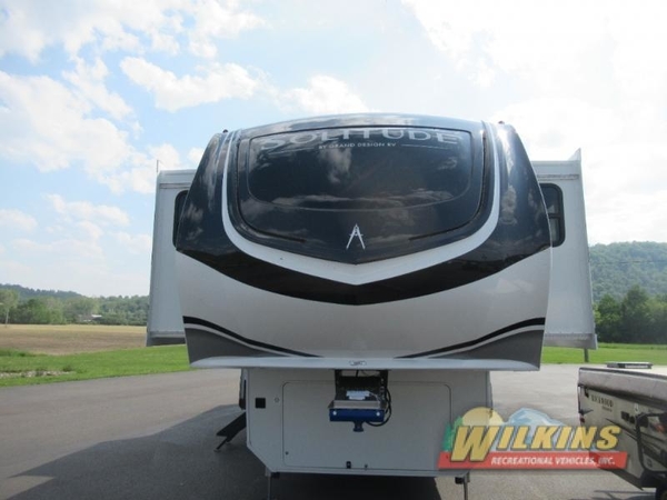 Each Solitude fifth wheel by Grand Design features a 101" wide-body construction, heavy duty 8,000 lb. axles, frameless tinted windows, and high-gloss gel coat sidewalls. You can camp year around thanks to the Weather-Tek Package that includes a 35K BTU high-capacity furnace, an all-in-one enclosed and heated utility center, and a fully enclosed underbelly with heated tanks and storage. Inside, you'll love the premium roller shades, hardwood cabinet doors, solid surface countertops, plus residential finishes throughout to make you truly feel at home. Each model also includes a MORryde CRE3000 suspension system, self adjusting brakes, and a MORryde pin box that will provide smooth towing from home to campground. Affordable luxury is possible with the Solitude fifth wheels; choose yours today!