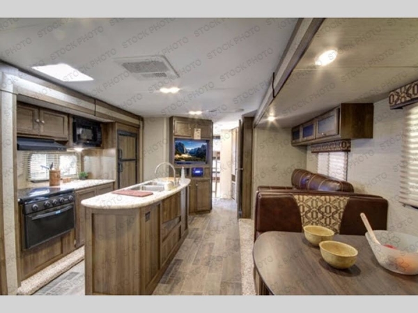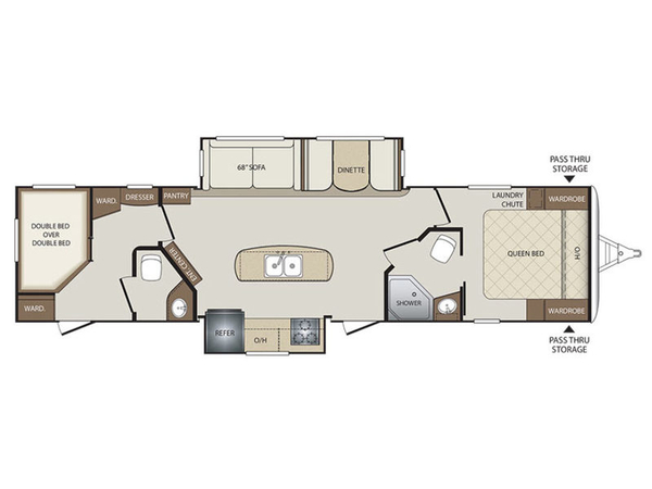 Step inside the main entrance of model 330BHS to find an open living area in this travel trailer. To your left is the first slide out including a three burner range, counter space, and a refrigerator. A kitchen island including a double sink is between the two slide outs. The second slide features a booth dinette, and sofa with overhead storage. A pantry for your non-perishables is next to the sofa. And the entertainment center is on the outer wall of the half bath for easy viewing from anywhere in this space.
