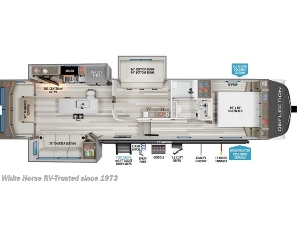 Outdoor living is a breeze with a massive power awning, exterior speakers, and plenty of pass-through storage for your gear.