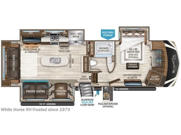 Outdoor living features: 16 awning, 10 4 secondary awning, and optional pull-out exterior kitchen