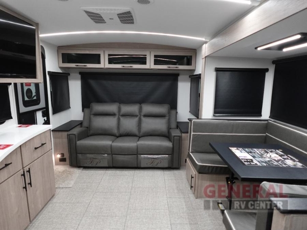 Just imagine leaving the world behind and secluding yourself away with your favorite people in your Grand Design Imagine travel trailer! The Imagine has been designed to enjoy extended season camping and includes a high-capacity furnace, a heated and enclosed underbelly with suspended tanks, a designated heat duct to the subfloor, and a high-density roof insulation with attic vent. You'll have maximum head room on the interior with 81" radius ceilings, and large panoramic windows to let in natural lighting. The exclusive drop-frame pass-through storage compartment is going to allow you to bring along lots of equipment, and the universal docking station is an all-in-one location for utilities and hook-ups. You'll also have oversized tank capacities so that you can fill and empty your tanks less often.