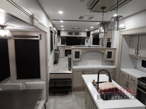 Each minute spent in this spacious fifth wheel will feel just like home! The rear living area includes a rear entertainment center with an LED Smart TV and a fireplace, overhead cabinets, theater seating, plus two tri-fold sofas for your guests to sleep on. You will have the front private bedroom all to yourselves with a private bed slide out and the front closet provides all the space you need to store your belongings. This model includes a spacious full bath plus dual bath sinks for ultimate convenience. The chef of your group will love the middle kitchen with its convenient island including double sinks, a residential cooktop and built-in oven, 20 cu. ft. refrigerator, and free-standing dinette. Head outdoors to find a 16' power awning with LED lights and middle pass through along with rear storage including a sliding tray.