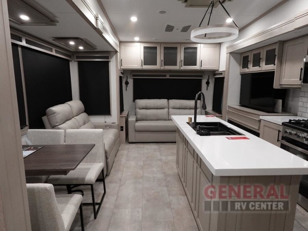 Are you looking to upgrade from a travel trailer to a fifth wheel? If so, this model will be perfect for you! Once you arrive at the campground, you can unload your gear from the pass-through storage, put out the two power awnings, then relax with a cold drink. Inside, you can kick your feet up on the theater seating, play a game at the free-standing dinette, or relax on the tri-fold sofa. The chef of your group will have a kitchen island with a Smart sink, dishwasher prep if you want the option to make cleaning up easier, plus a spacious 20 cu. ft. 12V refrigerator. There is also a built-in oven, plus a pantry and a hutch for storage galore! Having two bath sinks in the full bath is sure to be a big convenience when getting ready for bed, and the queen bed slide out in the front bedroom will provide a great night's rest. You will also find a front wardrobe, a slide top dresser, plus washer/dryer prep!