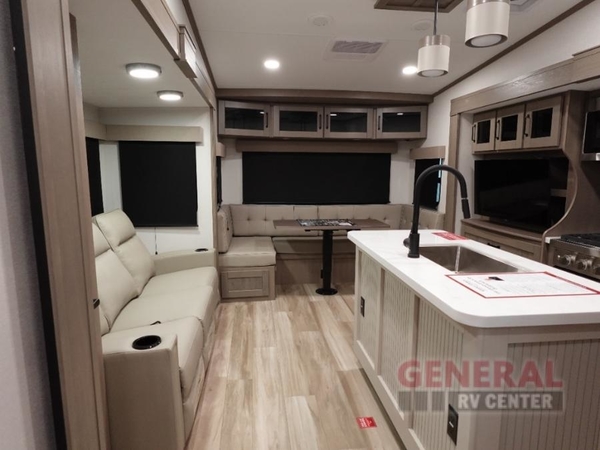 With any Reflection fifth wheel by Grand Design, you will have a solar panel for off-grid camping and a 60 amp charge controller and inverter prep, a Universal All-In-One docking station, unobstructed pass-through storage, and Goodyear Endurance tires. Each is constructed of gel coat exterior sidewalls, residential 5" truss rafters, walk-on roof decking, a fiberglass and radiant foil roof and front cap insulation plus laminated aluminum framed side walls, roof and end walls in slide rooms. Head inside to enjoy residential hardwood cabinet doors, premium Congoleum flooring, a spacious shower with a glass door, and many more comforts!
