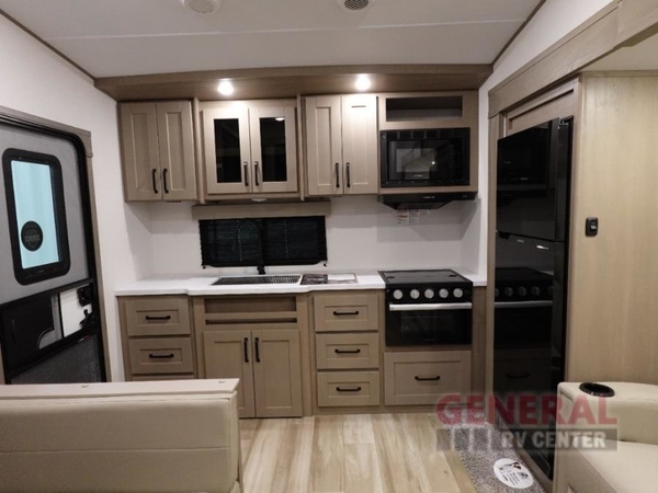 This rear kitchen fifth wheel is sure to meet all of your camping needs! Since the exterior length is only 26' 11", you can easily maneuver in and out of campgrounds. The rear kitchen includes ample counter space to prep meals, a three burner cooktop, and overhead storage for all your necessities. There is a 10 cu. ft. 12V refrigerator within the slide out that also includes the theater seating, and the U-shaped dinette provides a place to dine or play a card game. You will appreciate having convenient storage by the entry door, along with pull-out pet bowls, a functional wardrobe closet in the bedroom and an exterior pass-thru for belongings and camping gear.