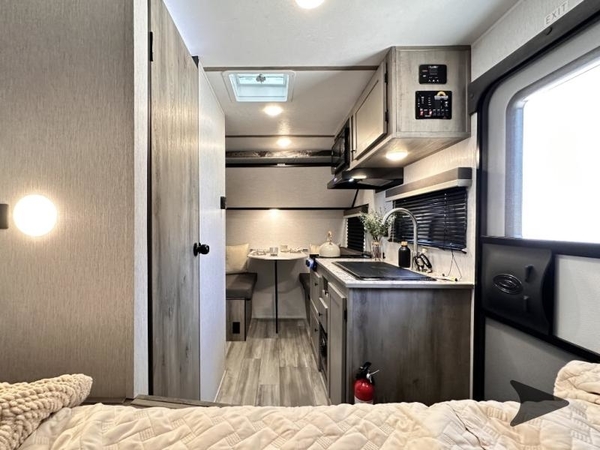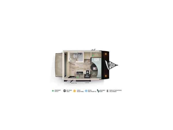 The Go Lite Skybreaker 12 may be compact, but its loaded with features you'd expect in a much larger trailer. It comes equipped with a full kitchen, a dinette, a dry bath, a bunk bed, and a tent bedproviding three separate sleeping areas. You'll also enjoy tons of storage and panoramic windows that keep you connected to the great outdoors. Its an awesome little model built for big adventures.