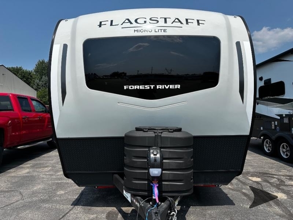 With any Flagstaff Micro Lite travel trailer by Forest River you will enjoy lightweight towing, durable construction, and added interior comforts to make each trip memorable! Each model features RoadTech tire pressure monitoring, Dexter Torflex axles, and nitrogen-filled Goodyear endurance tires for smooth towing from home to campground. The 6-sided aluminum framed construction provides a strong foundation so you can enjoy your RV for years to come, plus the radiant foil in the front cap, underbelly and slides help insulate your trailer. Additional exterior features include a 200W solar panel, back-up camera prep, frameless windows, and slam baggage doors. Each model includes the Great Expectations Package with roller shades, solid surface kitchen countertops, and hidden hinge cabinet doors. There is also an exterior hot/cold water port, outside speakers, a power tongue jack and stabilizer jacks, plus many more conveniences.