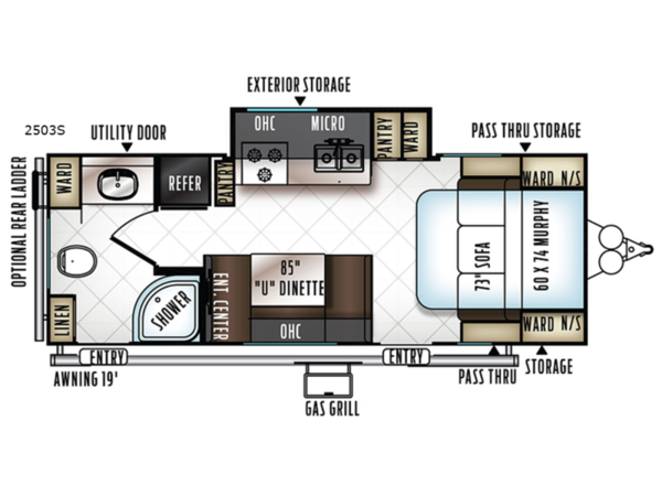 Wow! You need to take a look at this Rockwood Mini Lite 2503S by Forest River to find a travel trailer with the convenience of dual entry, a sofa and Murphy bed combination, and a slide out for more interior floor space. There are plenty of overhead cabinets throughout the trailer for your dishes, games, and such, as well as exterior storage for your outdoor gear. You can even choose an optional rear ladder and a curbside gas grill. The grill makes cooking outside fun for the family.