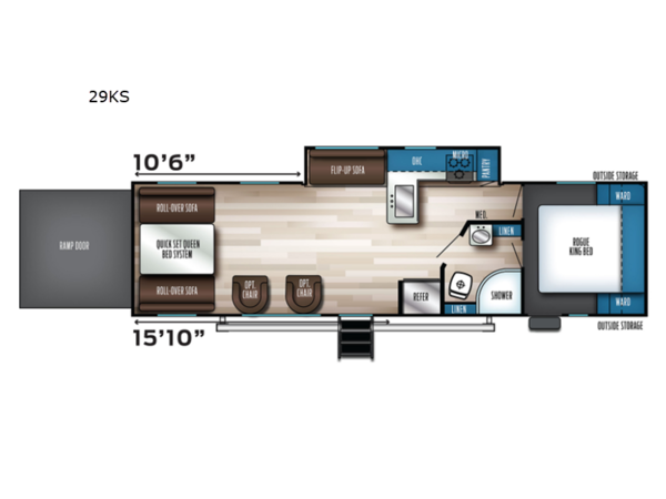 Bring along your kayaks, dirt bikes, or even a side-by-side in this toy hauler. There is 15' 10" total garage space, and a ramp door for easy unloading. Once your toys are out, enjoy lunch at the roll-over sofas, or let your guests rest on the quick set queen bed system before heading out. There is a dual entry bath to clean up in each day, and the Rogue king bed is sure to bring sweet dreams. In the morning, prepare eggs and bacon on the three burner cooktop, and the milk can go back in the 10.1 cu. ft. residential refrigerator. This model also includes a flip-up sofa for more seating and sleeping space, and you can add the optional lounge chairs too!