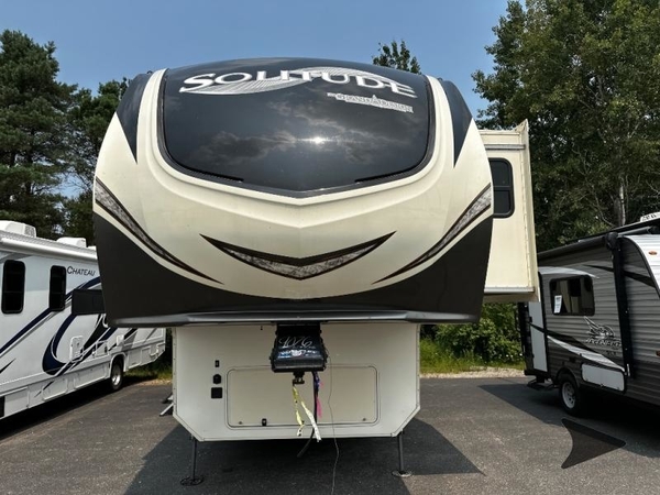 You will find it easy to extend your stay awhile in this Grand Design Solitude fifth wheel model 360RL. This unit features all of the amenities of home including a spacious kitchen with an 18 cu. ft. refrigerator, a kitchen island, an entertainment center with fireplace, and private front master bedroom, plus more!