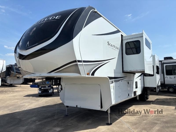Each Solitude fifth wheel by Grand Design features a 101" wide-body construction, heavy duty 8,000 lb. axles, frameless tinted windows, and high-gloss gel coat sidewalls. You can camp year around thanks to the Weather-Tek Package that includes a 35K BTU high-capacity furnace, an all-in-one enclosed and heated utility center, and a fully enclosed underbelly with heated tanks and storage. Inside, you'll love the premium roller shades, hardwood cabinet doors, solid surface countertops, plus residential finishes throughout to make you truly feel at home. Each model also includes a MORryde CRE3000 suspension system, self adjusting brakes, and a MORryde pin box that will provide smooth towing from home to campground. Affordable luxury is possible with the Solitude fifth wheels; choose yours today!