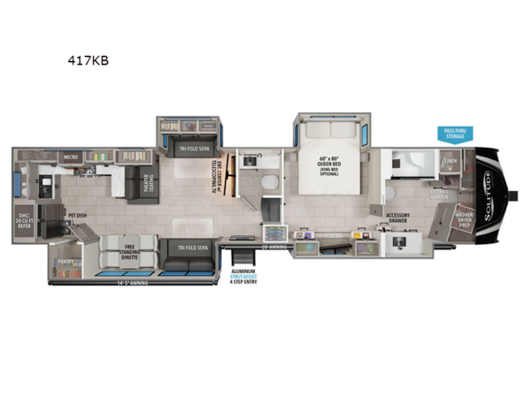 Comfort will come easy in this four slide out fifth wheel! You will feel right at home with a master bedroom that includes a queen bed slide out with a king bed option, dual dressers with a seat in between, plus a large front bath with tons of space. The convenient half bath is right as you enter the unit for convenience. Your crew can get cozy on the dual tri-fold sofas within dual opposing slides, or on the theater seating across from the LED TV and fireplace. One feature you will love about this fifth wheel is the rear kitchen with wrap-around counter space, a built-in oven, plus a 20 cu. ft. 12V refrigerator and a large pantry to keep food fresh.
