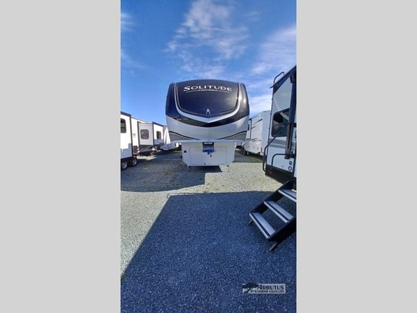 Each Solitude fifth wheel by Grand Design features a 101" wide-body construction, heavy duty 8,000 lb. axles, frameless tinted windows, and high-gloss gel coat sidewalls. You can camp year around thanks to the Weather-Tek Package that includes a 35K BTU high-capacity furnace, an all-in-one enclosed and heated utility center, and a fully enclosed underbelly with heated tanks and storage. Inside, you'll love the premium roller shades, hardwood cabinet doors, solid surface countertops, plus residential finishes throughout to make you truly feel at home. Each model also includes a MORryde CRE3000 suspension system, self adjusting brakes, and a MORryde pin box that will provide smooth towing from home to campground. Affordable luxury is possible with the Solitude fifth wheels; choose yours today!