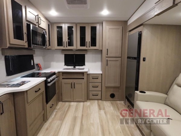 You will love this fifth wheel featuring a single slide for added interior living space and all the comforts and conveniences it provides you while you travel. The slide features a 78" theater seat plus there is a breakfast nook for more seating. Both can easily view the entertainment center with 40" TV. A rear kitchen indoors provides everything you need to create meals like home while on the road, and if you want to spend as much time outside as possible, then the outdoor griddle will certainly accommodate you for meals. Up front, a cozy private bedroom with queen bed, wardrobe, and overhead cabinets. Right next door, you will find a large walk-in shower, as well as a toilet, and a vanity with sink and linen cabinet for your towels and toiletries. You will also love the full unobstructed pass-through compartment for all of your gear, plus so much more!