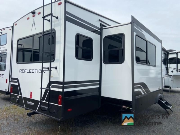 With any Reflection fifth wheel by Grand Design, you will have a solar panel for off-grid camping and a 60 amp charge controller and inverter prep, a Universal All-In-One docking station, unobstructed pass-through storage, and Goodyear Endurance tires. Each is constructed of gel coat exterior sidewalls, residential 5" truss rafters, walk-on roof decking, a fiberglass and radiant foil roof and front cap insulation plus laminated aluminum framed side walls, roof and end walls in slide rooms. Head inside to enjoy residential hardwood cabinet doors, premium Congoleum flooring, a spacious shower with a glass door, and many more comforts!
