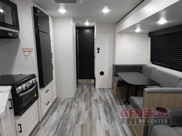 The whole gang can join along on camping trips in this double slide out travel trailer! There is a rear private bunkhouse with a bunk bed and J-cube futon sofa below plus two additional bunks across the room. You'll find your own space in the front private bedroom, which also includes an RV queen bed and dual wardrobes. The middle kitchen and living room will be a favorite place to come together since there is a jack-knife sofa and U-shaped dinette plus a fully-equipped kitchen to make meals each day. This model also includes a full bath with one of the dual entry doors for added convenience!