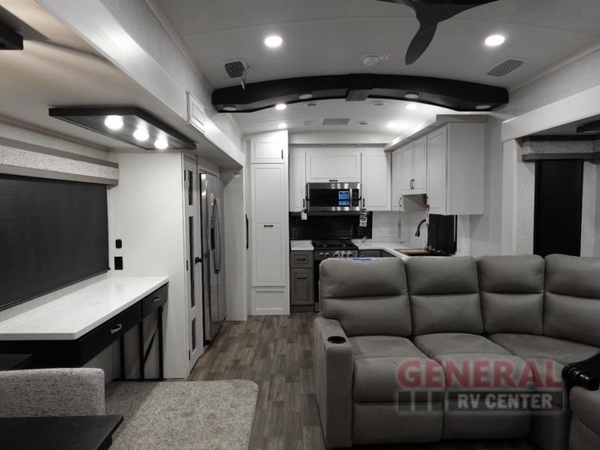 You can't go wrong when camping in this triple slide out fifth wheel! Once you've arrived at your destination and unloaded the pass-through storage, you can make lunch in the rear kitchen with generous counter space. There are also two pantries, one being a pull-out, plus a convenient pull-out butcher block so you can chop fresh veggies! You can enjoy your meal at the roll-top dinette with chairs, and if you need to get some work done, the desk/coffee bar will provide a space for your laptop. An L-shaped sofa and theater seat in the main living area will create an inviting space, plus there is a 65" TV and a mantle with a fireplace just like at home! Freshen up in the full bath at the end of the day, then head to the front private bedroom for a great night's rest on the king bed slide out. There is a closet with drawers and a hamper below, a chest with a TV.