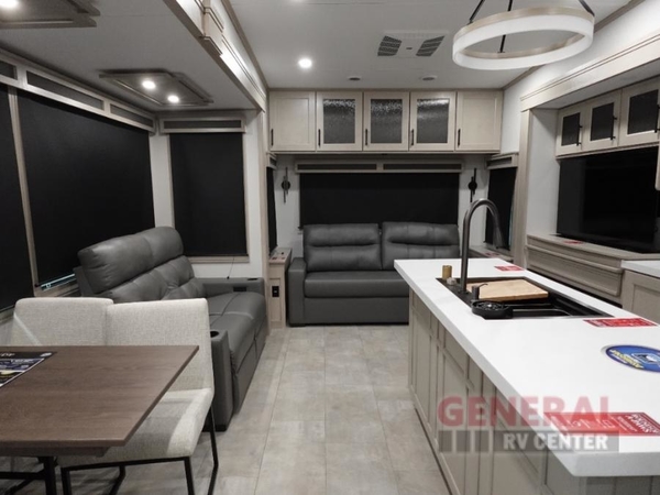Traveling for long periods at a time is made easy with this gourmet kitchen that can feed your entire group a holiday meal! The professional-grade stainless steel cooktop with a built-in oven, microwave, 12V 20 cu. ft. refrigerator, and a kitchen island offers everything you will need to enjoy cooking for your family and guests. There is abundant storage throughout multiple overhead cabinets, a kitchen pantry and hutch, a bath linen cabinet for your towels, and in the front master bedroom which features a large closet. In the bedroom there is also a King bed slide for added space to sleep comfortable at night. Two nice awnings will provide outdoor living space keeping you protected from the sun and rain, and you can add an optional pull-out kitchen to enjoy convenient cooking outdoors as well.