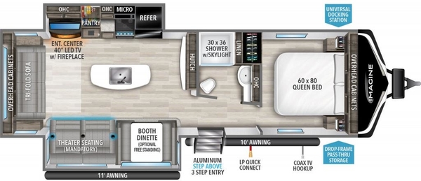 Check out this great rear living room floorplan in this new Grand Desgin Imagine 2970RL travel trailer. this (2) slide out model features opposing slides for additional living and comfort in the living area. Optional factory equipment on this unit includes: Imagine Peace of Mind Package, Ultimate Power Package, Four Seasons Protection Package, Solar Package, Goodyear tires, ABS Axle Assembly with Sway Control, Fireplace, Theater Seating with footrest, 50 amp electrical service, Free standing table with (4) chairs, and 2nd ducted roof air conditionier. NO HIDDEN FEES OR CHARGES ARE COLLECTED AT COACHLIGHT so CLICK THE RED INTERNET PRICE BUTTON to receive our special sales pricing that we are prohibited from posting on our webstie. The window sticker attached to this listing will provide more equipment specifiations on each of the packages listed above. Give Norm or Doug a call with questions at 800-799-7444.