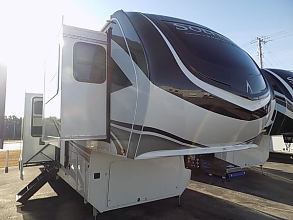 2026 Grand Design Solitude 380FL Fifth Wheel - This (5) slide out front living room model features (2) Tri-Fold Sofas along with a set of Theater Seating. A half bath in the kitchen area along with a raised floor bedroom and master bath at the rear allow for maximum exterior storage space. Featuring Grand Design's 1/3/5 year warranty, this unit has the following optional factory installed equipment: Solitude Residential Living Package, Peace of Mind Package, Weather-Tek Package, Max-Built Construction Package, Central Vac System, 20 cubic foot Refrigerator with 330 watt solar panel, 50 amp charge controller, Bluetooth Module, and (2) dock ports, OmniConnect Satellite, Cellular, and WiFi Internet Prep Package, Bedroom TV, Electric Fireplace, 12 volt lower tank heaters, 6 point Hydraulic Leveling Jacks, 17.5 H rated tires, King Bed Upgrade (72" x 80"), 3rd 15,000 btu Roof air with Heat Pump, Generator Prep, Extra Solar Panel ( 330 Watt panel / (2) total with 2000 watt inverter), and 8000 lb axles with ABS Drum Brakes. NO HIDDEN CHARGES OR FEES ARE COLLECTED AT COACHLIGHT. CLICK THE RED INTERNET PRICE BUTTON on the listing to receive our sales price with no fees. This price cannot be shown on our website due to factory requirements. The window sticker on this unit will provide additional specifications and information. Give Norm or Doug a call at 800-799-7444 for more informaiton.